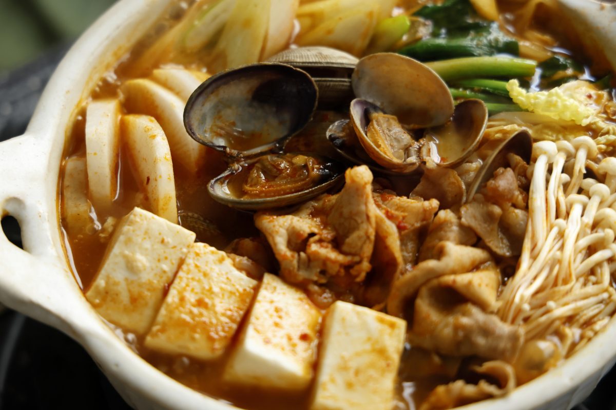 鍋に水とチゲ鍋の素を入れ、あさりと大根を加えて中火にかける。煮立ったら豚肉、白菜、えのきだけ、長ねぎを加えて弱火で煮る。火が通ったら、にらと豆腐を加えてひと煮する。